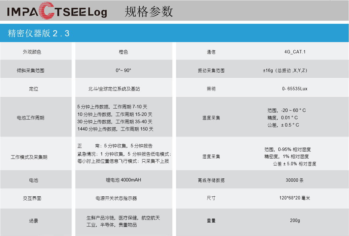 是PRMIERSE系列沖擊記錄儀的旗艦型號,便攜式精密儀器版2.3系列產(chǎn)品是基于CAT.1_ 4G通信技術(shù)和ITO技術(shù)的記錄儀,用于收集和監(jiān)測各種數(shù)據(jù),如溫度、濕度、照度、傾斜值、振動值、位置等。